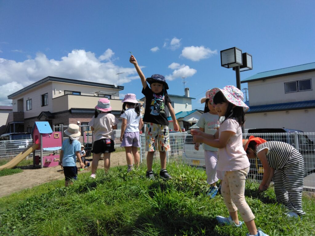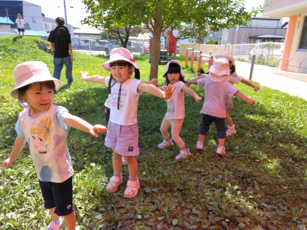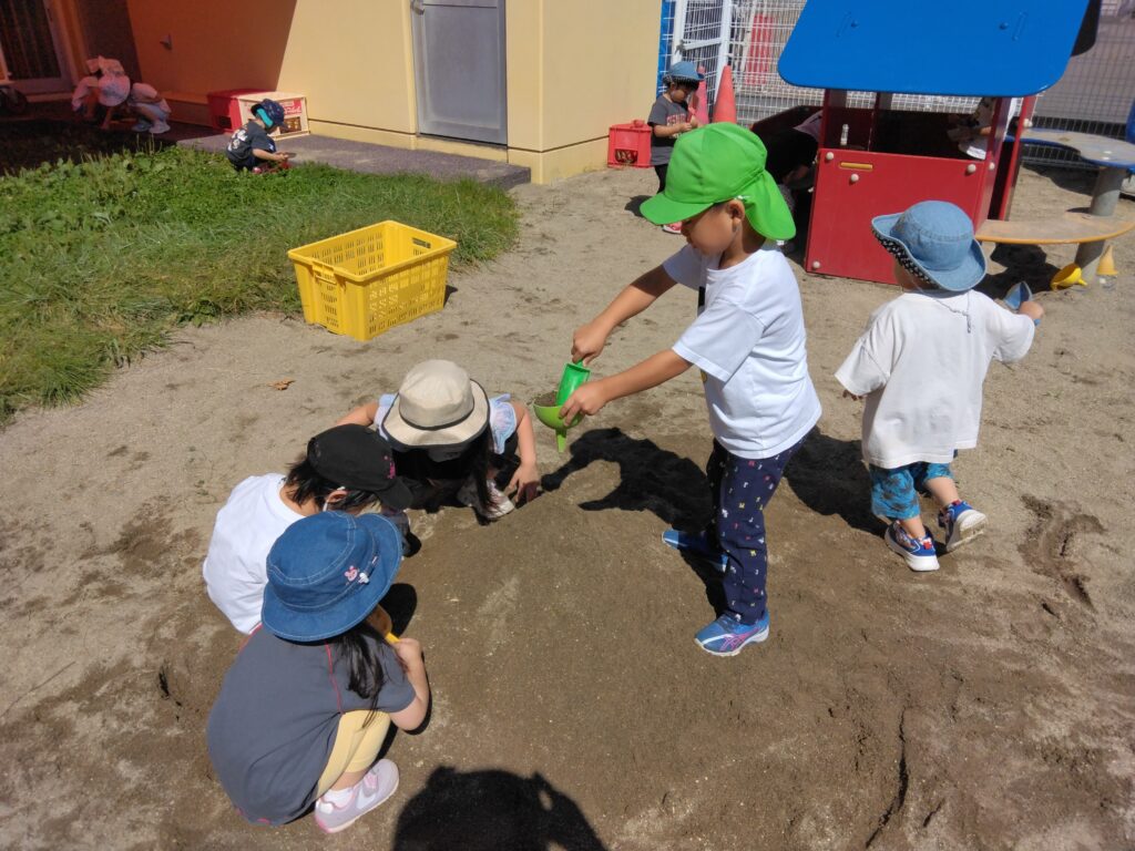 夏から秋になり、園庭にはトンボが飛んでいたりして、山の上から「トンボとまるかな?」と腕を空に掲げて、とまるのを待っていました!他にも運動会のお遊戯を踊ったり、砂場でトンネルを作って遊んでいましたよ✨