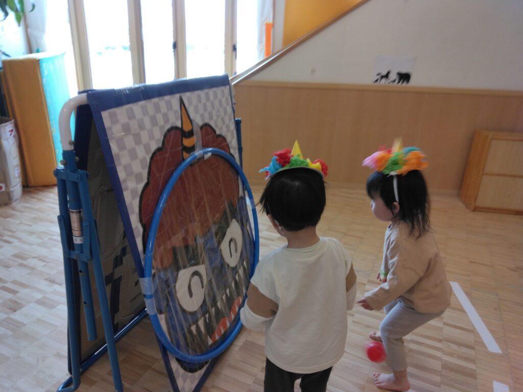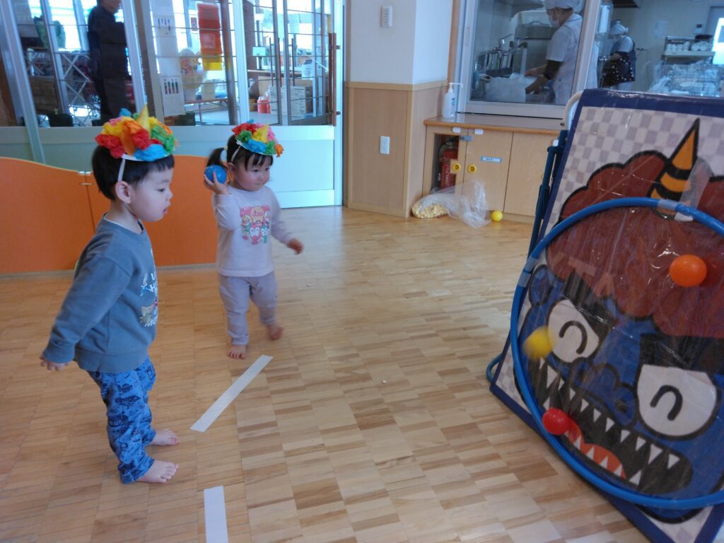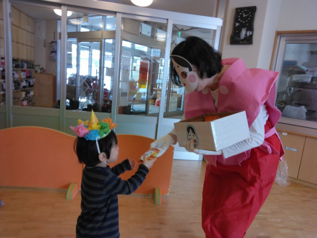 小ホールで鬼にボールをぶつけた後に、福の神からお菓子をもらいました