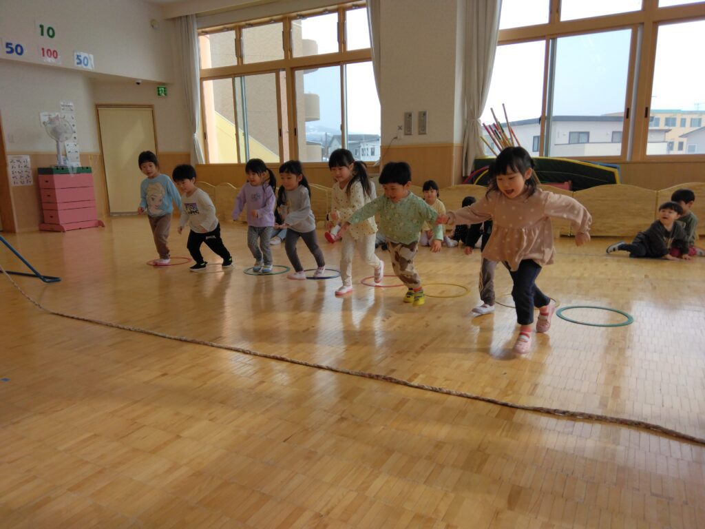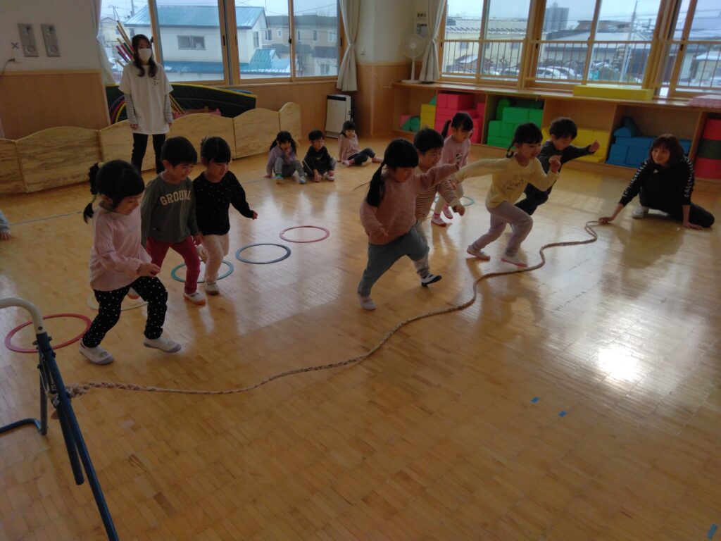 今月は縄跳びをつかって楽しく体を動かし遊びました。