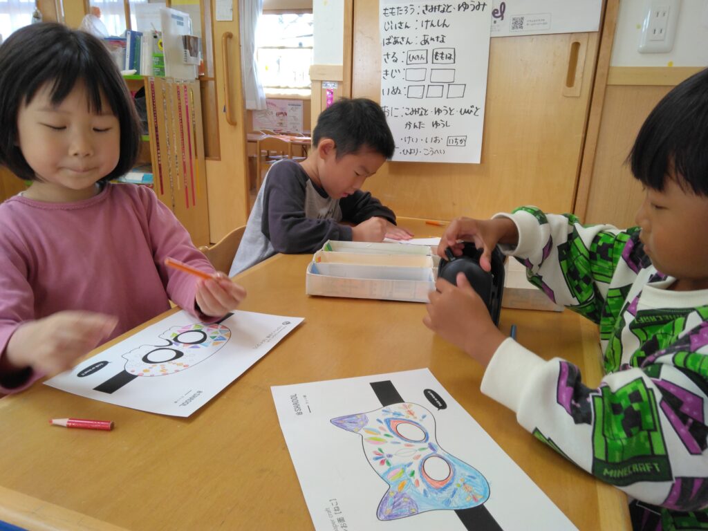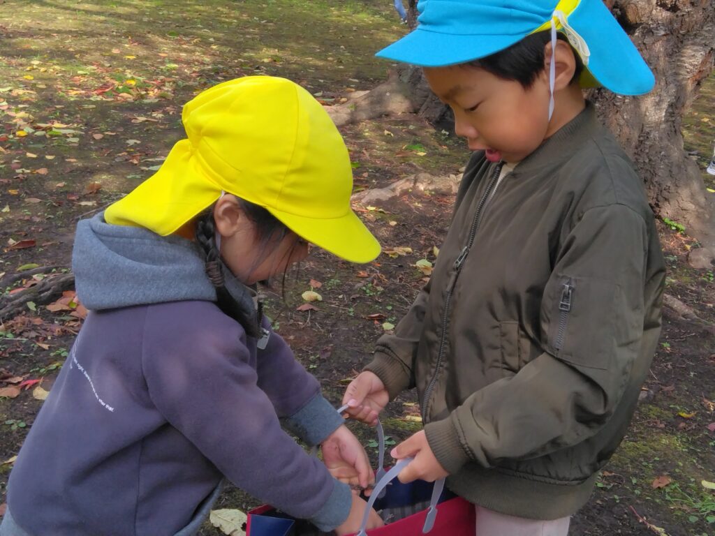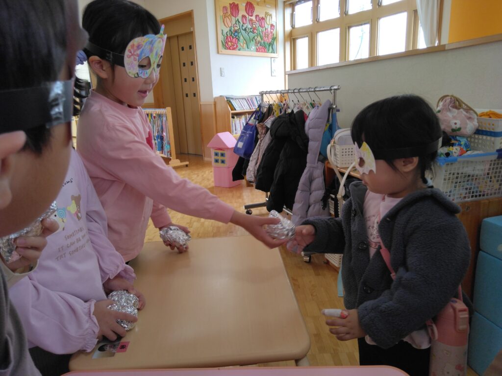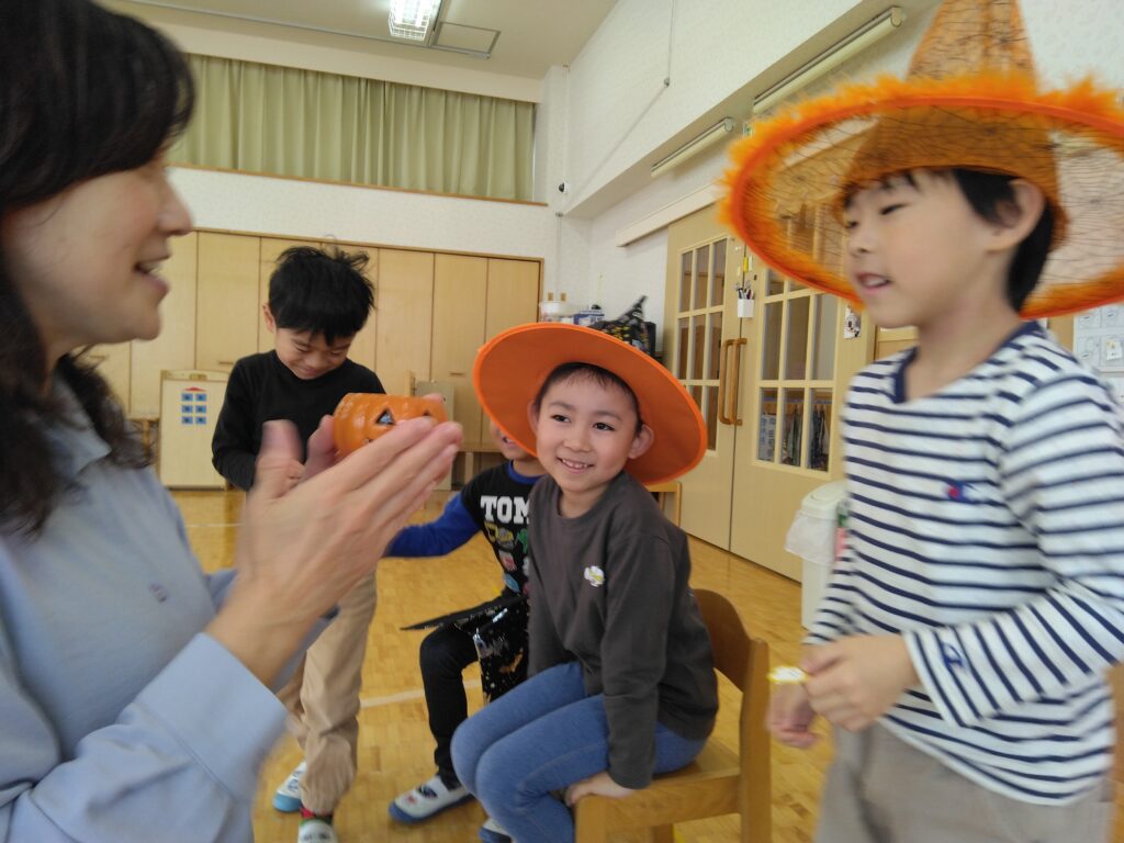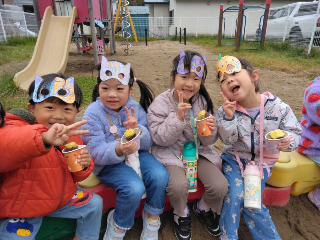 31日を楽しみにしてきました。トリックオアトリートって言ってくれたら、さつまいもを渡そう!という話になりました☺お花紙で作ったお芋を持ってハロウインごっこをして当日を迎えました。