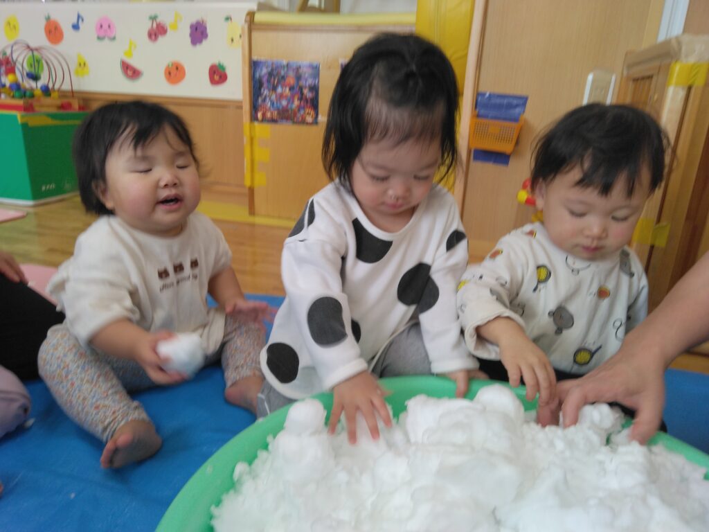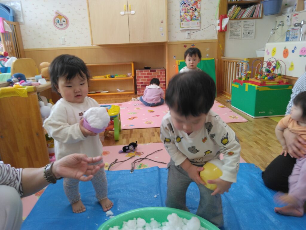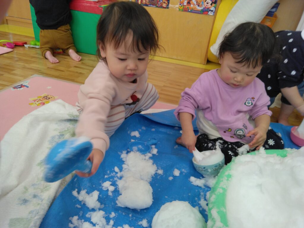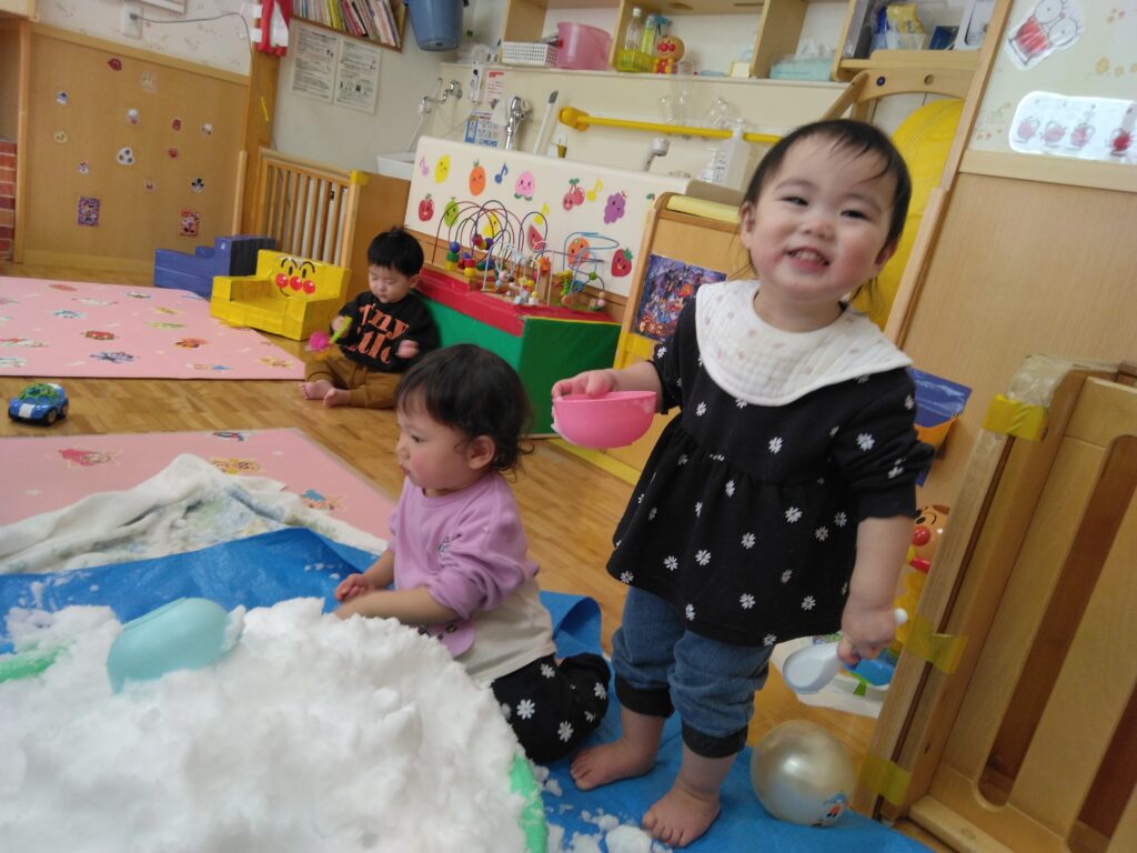 お部屋で、雪の感触を楽しみながら遊びました♪つめた~い!!