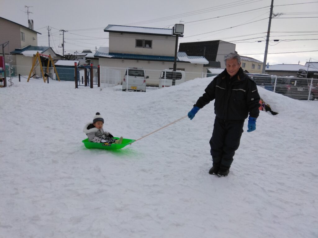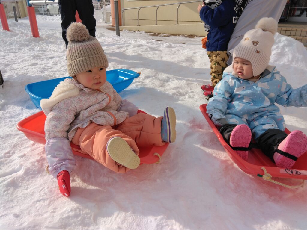 園庭でそりに乗ったり、雪の感触をたのしみながらたくさん歩きました♪☃