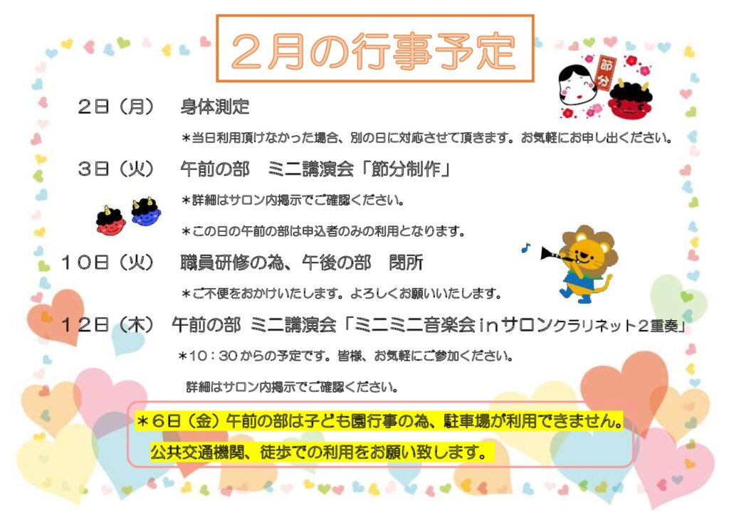 - 風邪症状や発熱などがある方はご利用をお控えください。また、解熱後24時間経過し、呼吸器症状が改善されてからサロンをご利用下さい。