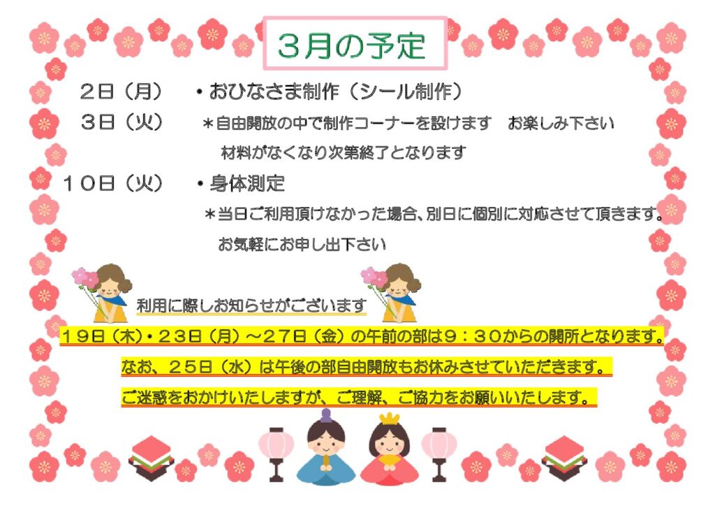 - マスクの着用は原則任意としますが、活動が室内であることや、その日の利用状況(人数、妊婦や高齢者、基礎疾患をお持ちの方)を十分配慮された上で、感染リスクとなる行動を避けたご対応をお願いします。
